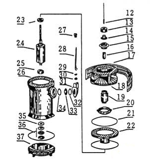 31.出線 32.封環(huán)(Φ74×3)33.接線板 34.封環(huán)(Φ50×3) 35.墊片 36.軸承8204 37.下蓋