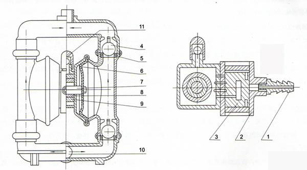 1 進(jìn)氣口 2 配氣閥體 3 配氣閥 4 圓球 5 球座 6 隔膜 7 連桿 8 連桿銅套 9 中間支架 10 泵進(jìn)口 11 排氣口