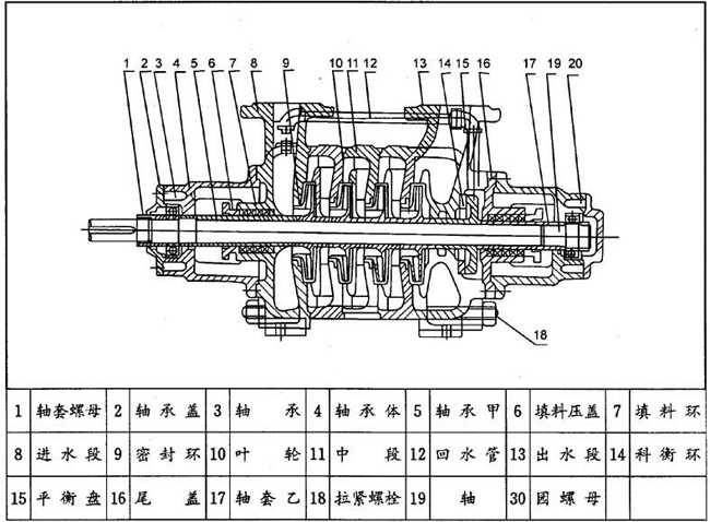 6.平衡環(huán)為鑄鐵制成,固定在出水段上,它與平衡盤(pán)共同組成平衡裝置。平衡盤(pán)為耐磨鑄鐵制成,裝在軸上,位于出7&段與尾蓋之間,平衡軸向力。軸套為鑄鐵制成,位于兩填料室處,作固定葉輪和保護(hù)泵軸之用。為易損件,磨損后可用備件更換。