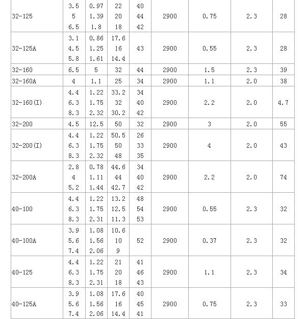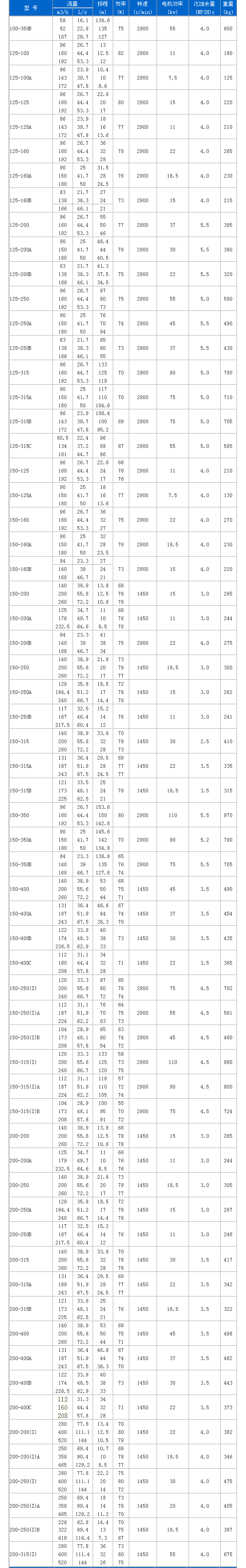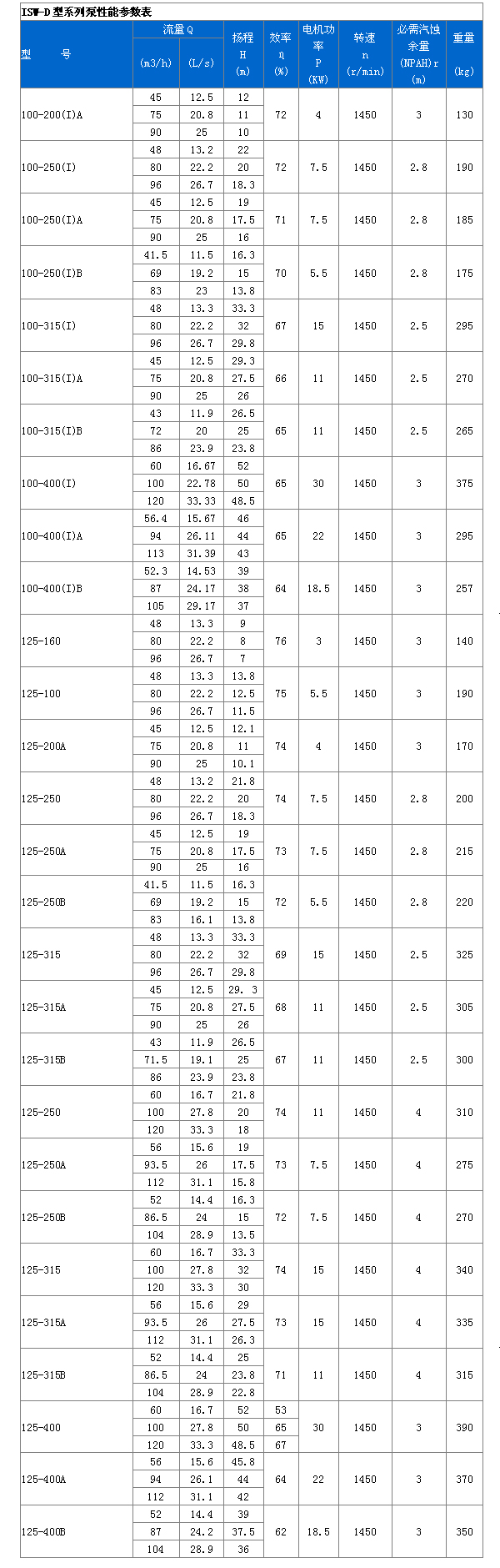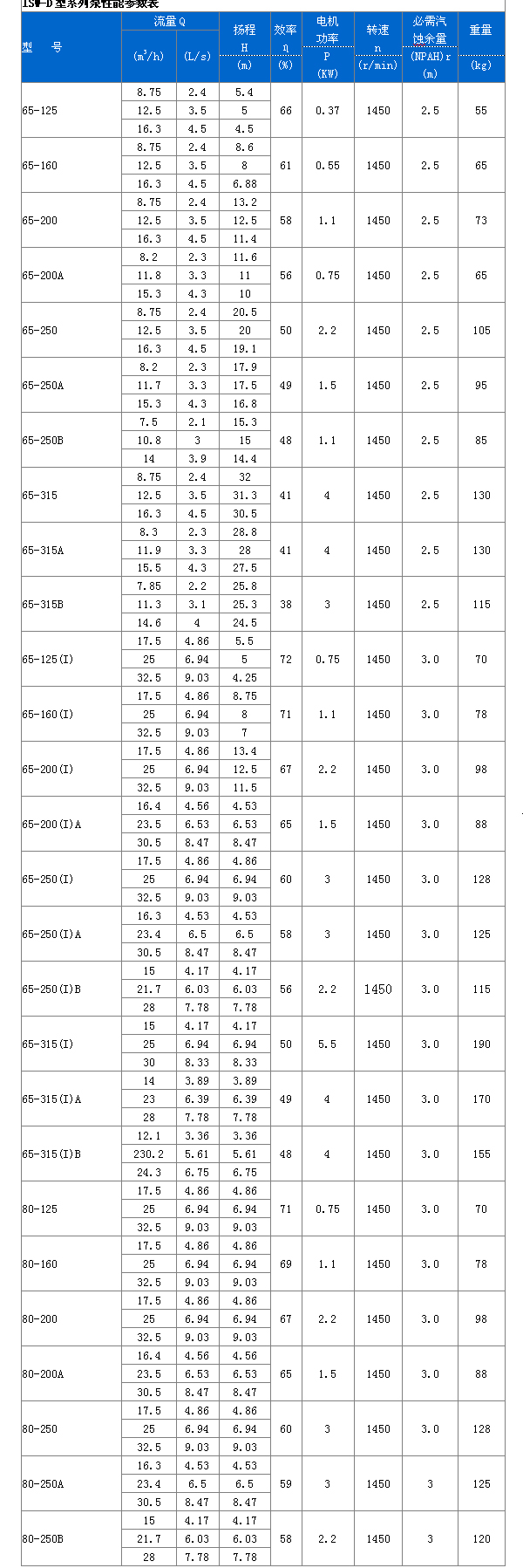 ISW型臥式管道離心泵 性能參數(shù):