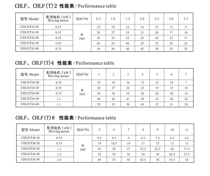 CHLF,CHLF(T)輕型段式多級離心泵 性能參數(shù):